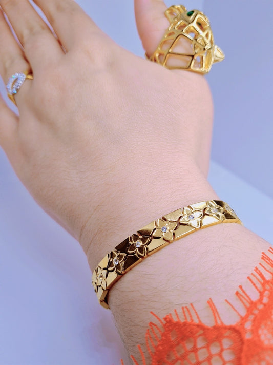 Bracelet Rigide Multi Trèfles Cristaux Luxe Acier Inoxydabel plaqué Or 18k 12g