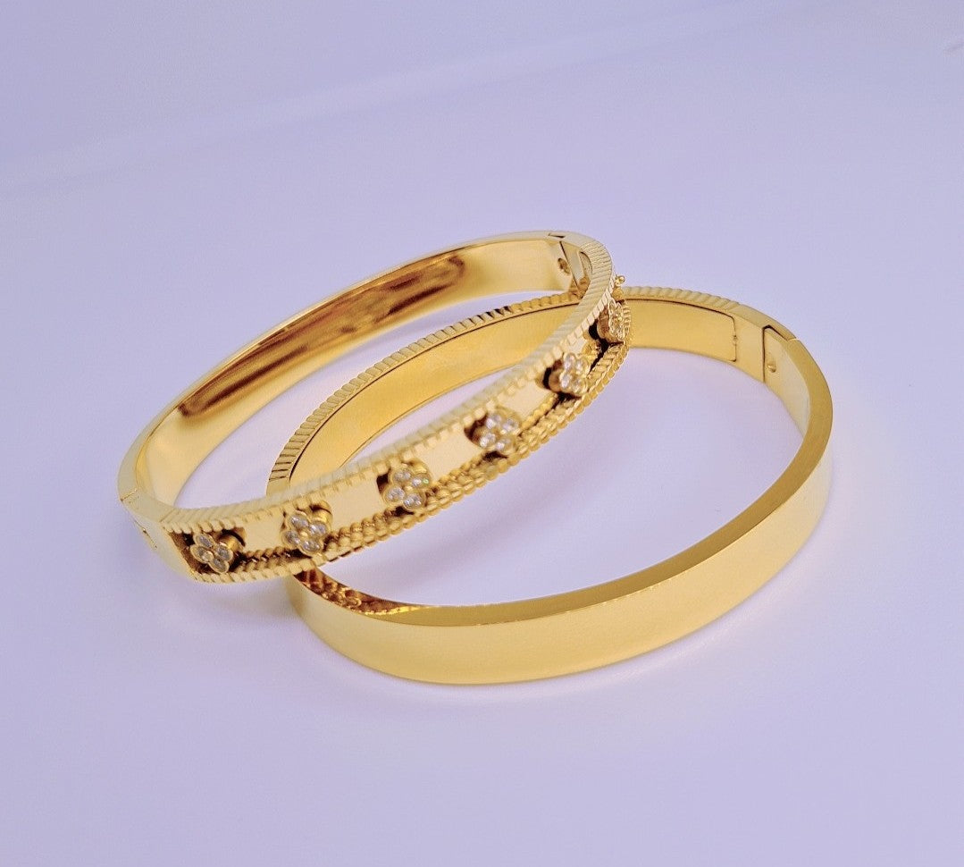 Découvrez l'élégance intemporelle avec notre bracelet rigide orné de trèfles délicats et de cristaux scintillants intégrés. Chaque détail de ce bracelet évoque la beauté naturelle et la chance, offrant une touche de raffinement à toute tenue.